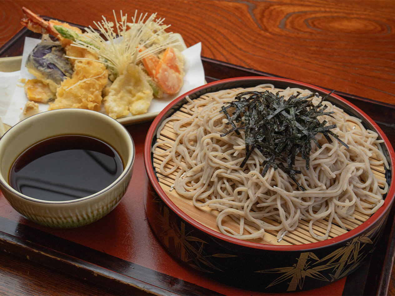 リバートレッキング後のランチは、“東京そば 大阪うどん”のユーモアあふれる看板に惹かれて、「元六」に。地元の人が多く集まるお店に期待が高まります。美味しそうな多彩なメニューに目移りしますが、そばと天ぷらのセットを注文。こだわりの手打ちそばは食感がよく、大きな海老と地元産の野菜の天ぷらでお腹が満たされます。