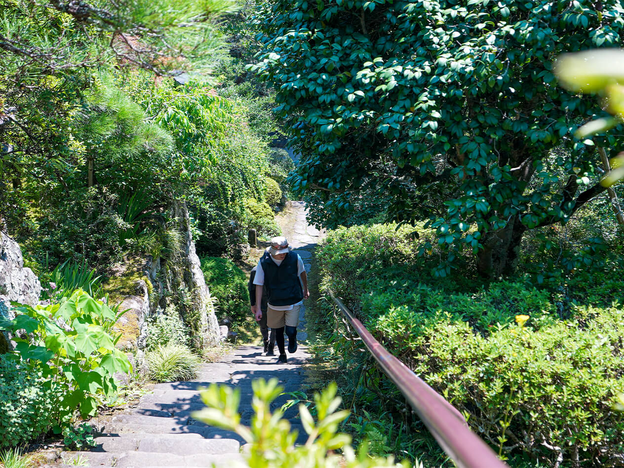 ランチと休憩をしっかりとった後は、観音霊場として長く信仰を集めてきた札所32番「法性寺」へ。駐車場に車を停め、秩父札所唯一の鐘楼門をくぐり抜けると、山の静寂に包まれて自然と厳かな気持ちに。美しい緑が両側に広がる石段を登っていくと、涼やかな空気に心も澄みわたります。階段を上り切った先に本堂が姿を現します。