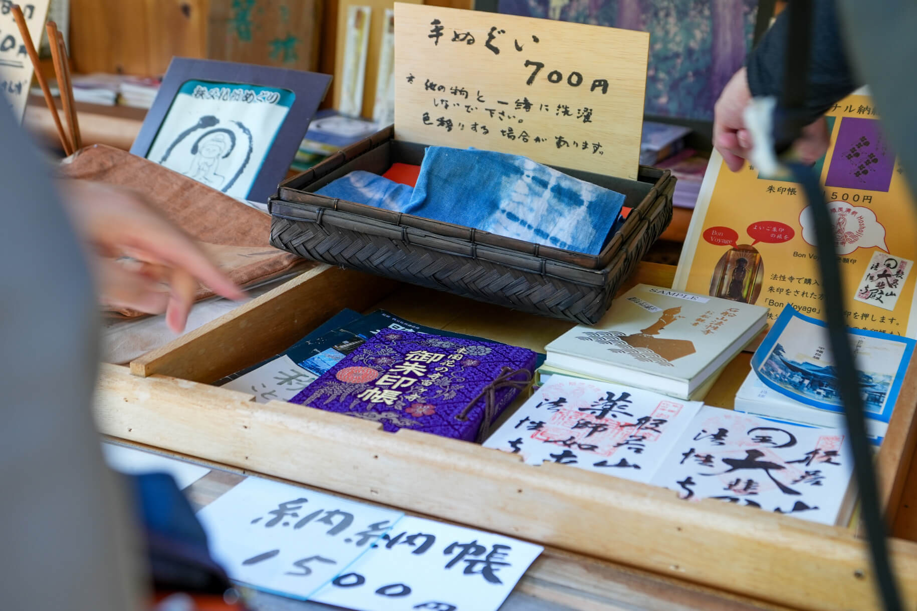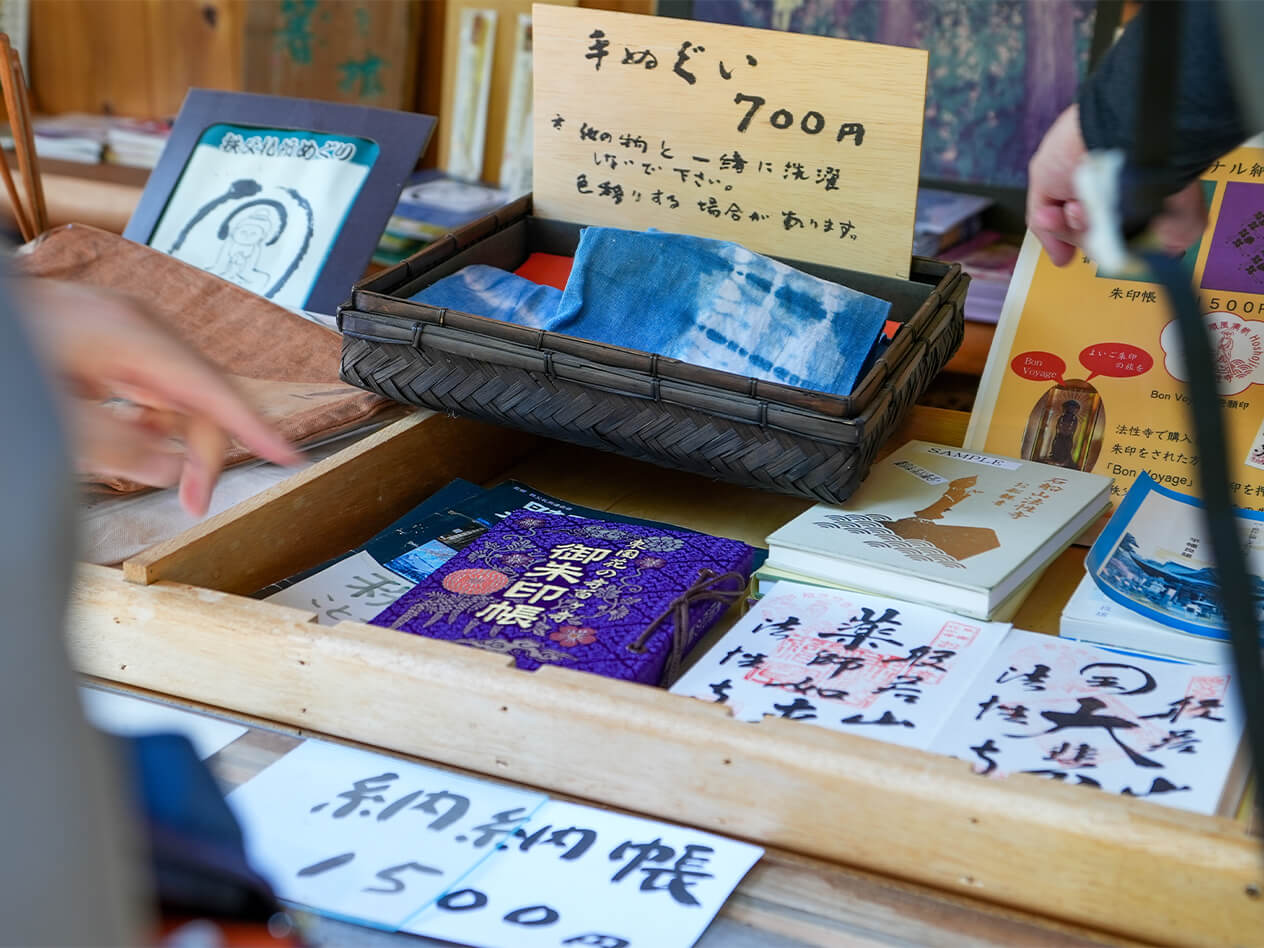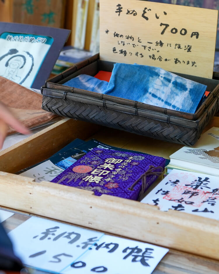 石段を登りきると、本堂に到着。山号にちなんだ般若のお面が出迎えてくれます。本堂からは四季の折々の草花に彩られた山寺ならではの景色が広がり、思わず深呼吸。本堂前の売店では、ここでしか手に入らないご住職の描いたイラストグッズや、心落ち着くオリジナルブレンドのコーヒー豆など、限定のおみやげも並びます。