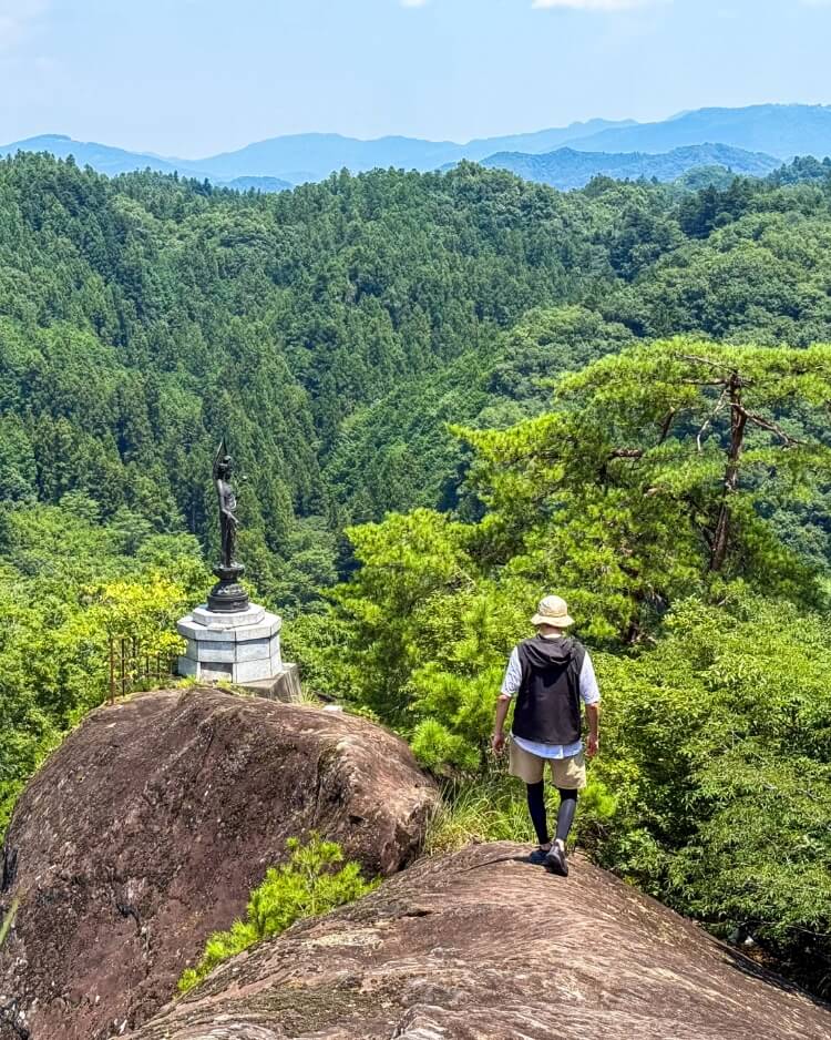 本堂の先には、岩壁に張り出した懸造の観音堂と、「タフォニ」と呼ばれる蜂の巣状の穴が無数にあいた岩崖が。風や雨が長い年月をかけて岩を浸食してできたアートのような姿に圧倒されます。岩場や鎖場もあるこの先の山道を30分ほど進むと、船の先のように突き出た砂岩「お船岩」に到着。断崖絶壁のスリルを乗り越えた先に、お船観音像と絶景に出会えた喜びが!