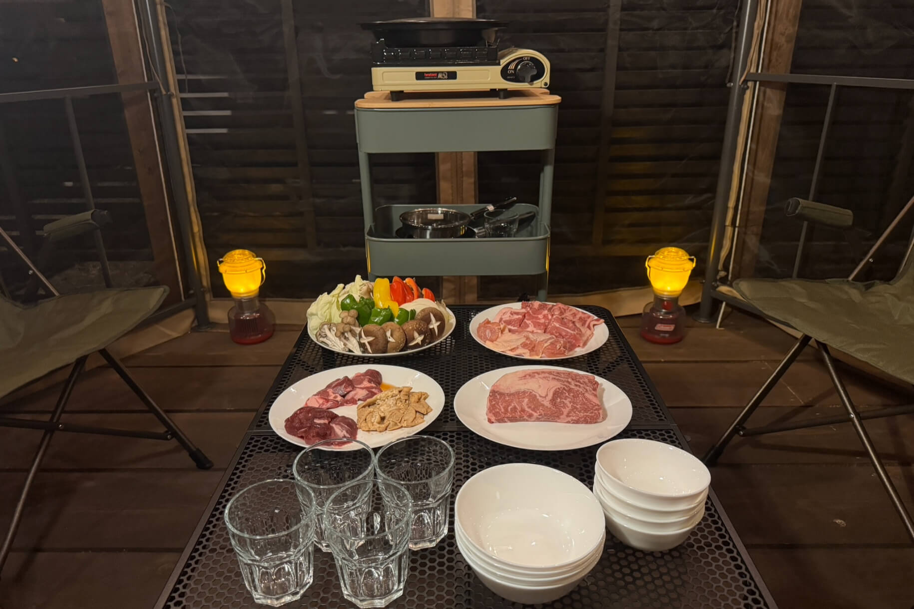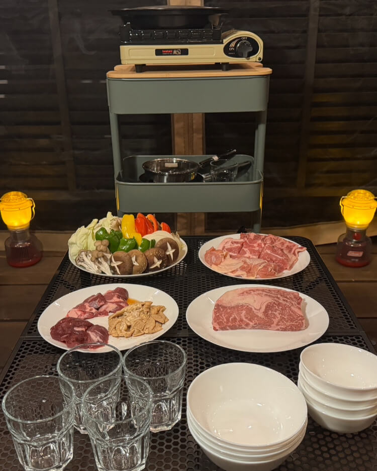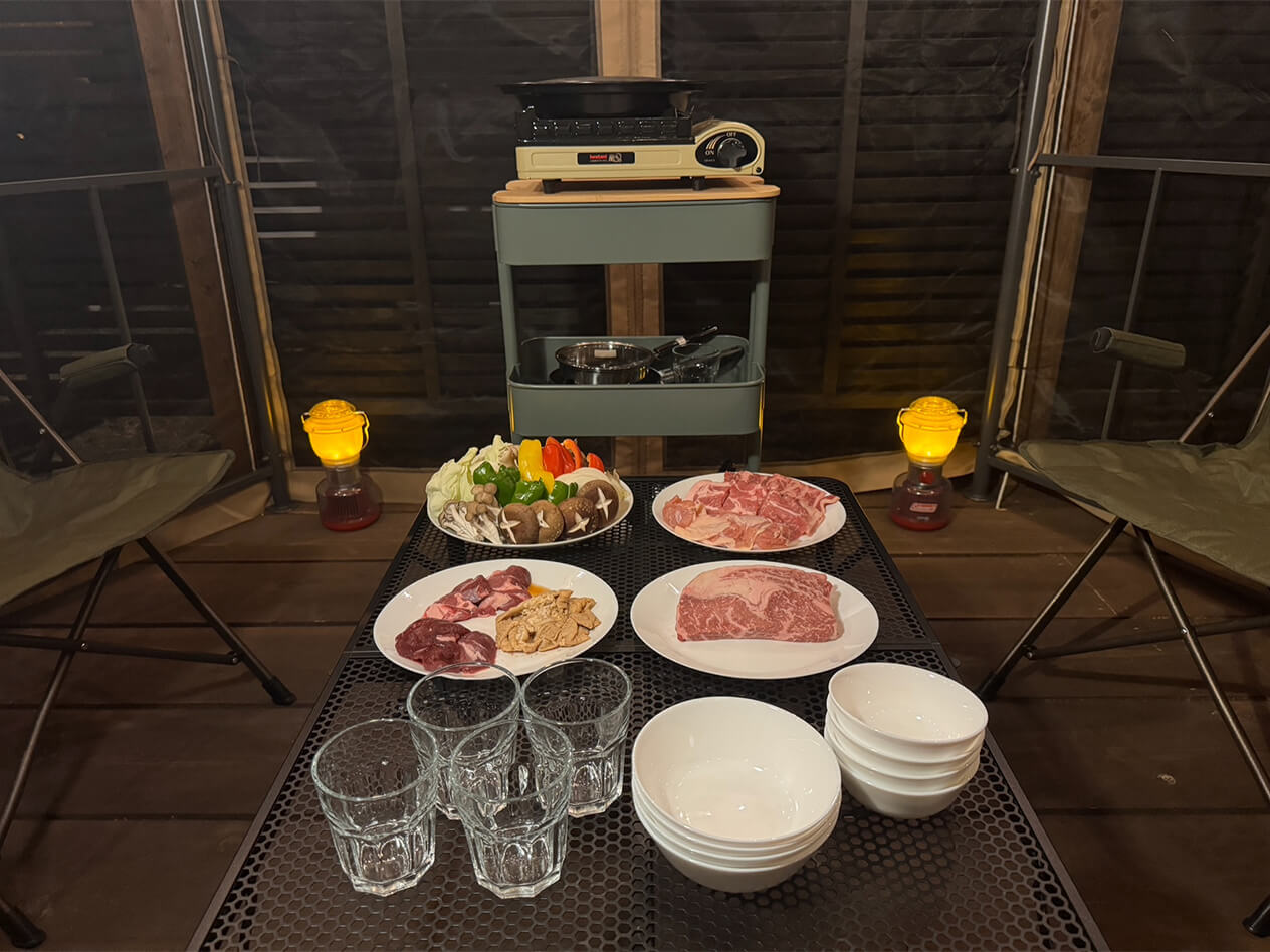 夕食はゲル型キャビンの前にある“ガゼボ(=東屋)”でバーベキュー。秩父地域ならではのジビエと、味付けホルモンが盛り合わせになっているお肉セットや、地元で採れたお野菜のセットを予約しておきました。バーベキューはアウトドアならではの醍醐味です。しかも、ここは屋根付きなので天気を気にせず楽しめるのが嬉しいポイント!