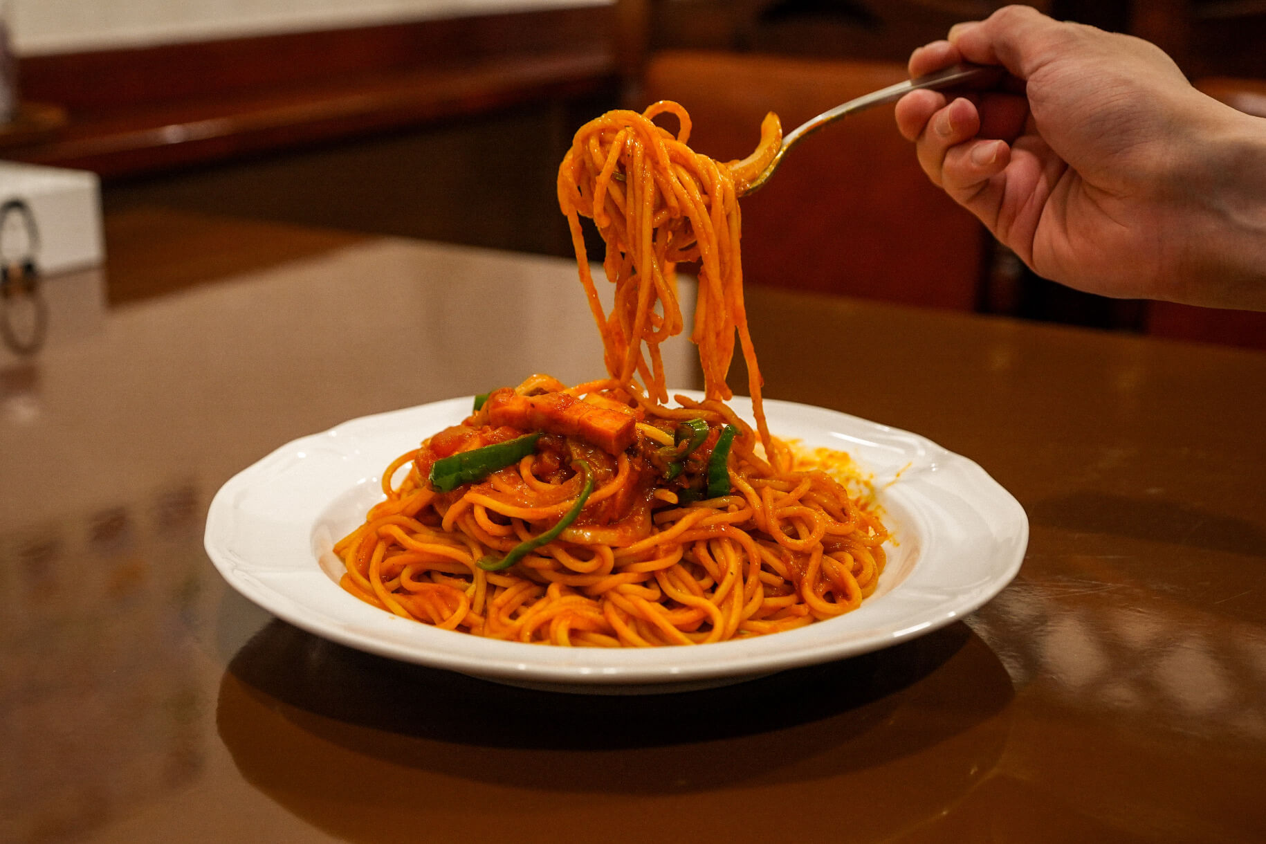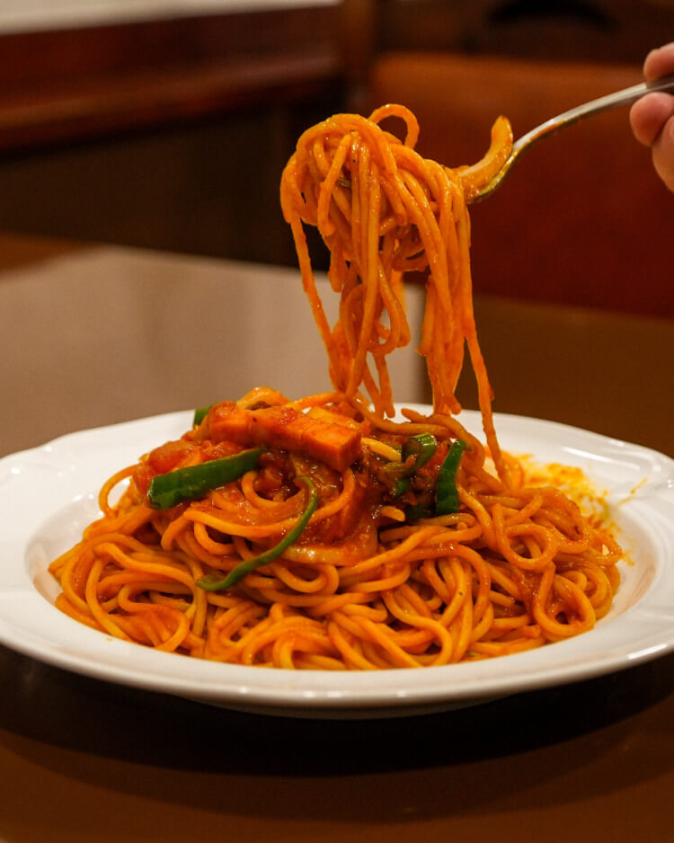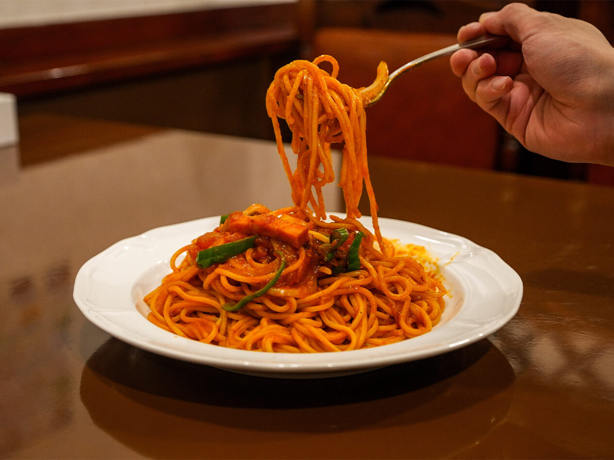 おがのまちの中心部に戻り、ランチには町の人も多く集まるという「喫茶・食事処 ひろば」へ。40年以上続く店の名物メニュー“ナポリタン”は、甘めのトマトソースとたっぷりの具材が、太めの柔らかいスパゲッティーによく絡んで、どこか懐かしい味わいです。お店のレトロな雰囲気に誘われ、食後にはクリームソーダも頼んで大満足です。