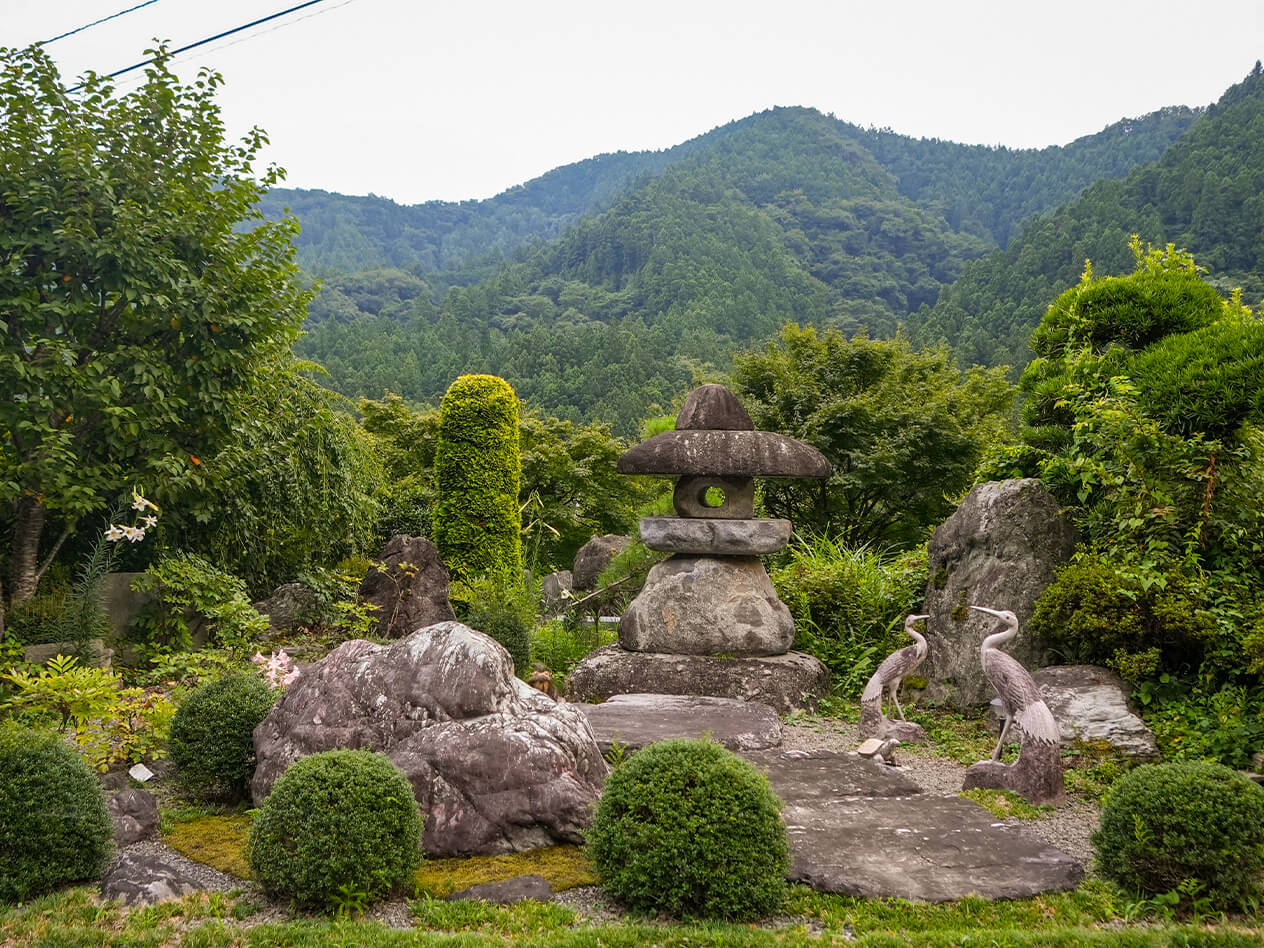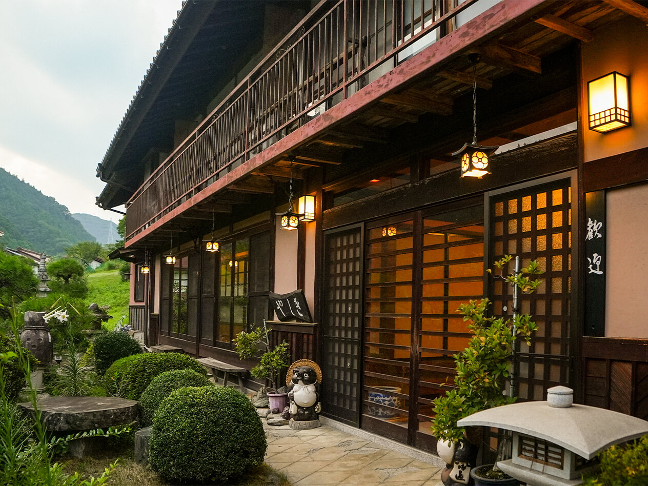 休憩後は、本日の宿「山あいの宿 やしき」へ。静かな山の中にたたずむ邸宅は、手入れの行き届いたお庭が美しく特徴的です。古き良き面影を残しつつも整えられた宿には、自然と調和する静かな時が流れています。切り盛りする女将さん手作りの夕食は、どれもしみじみと染み渡る美味しさ。日々の疲れが癒やされ、ゆっくりと心身を整える時間です。