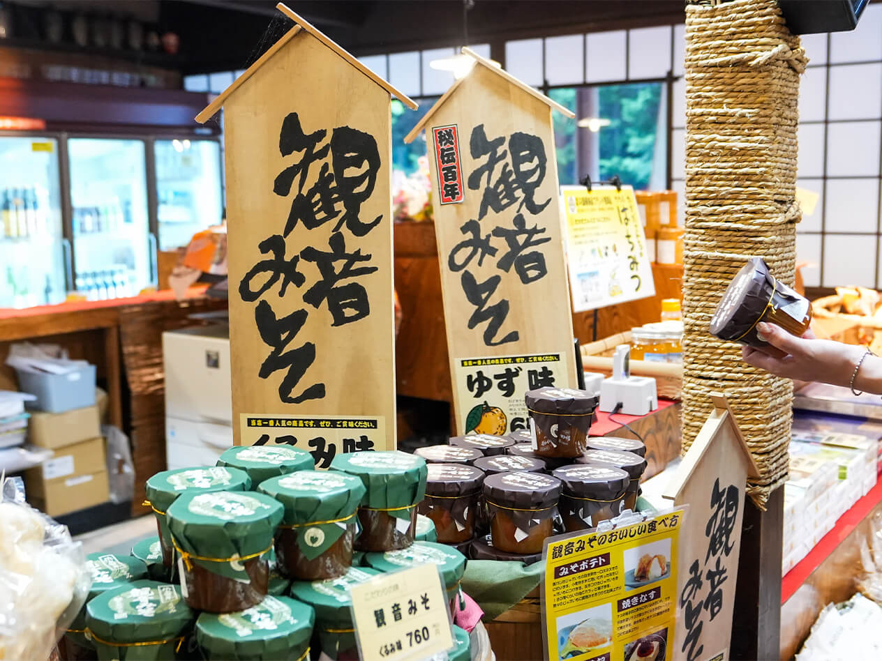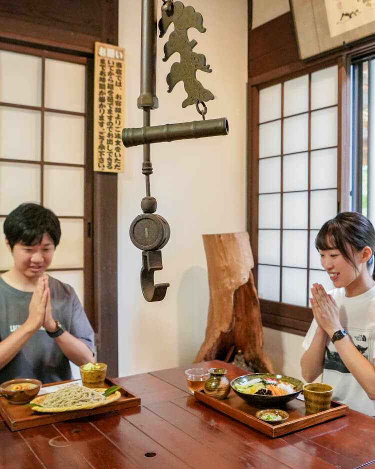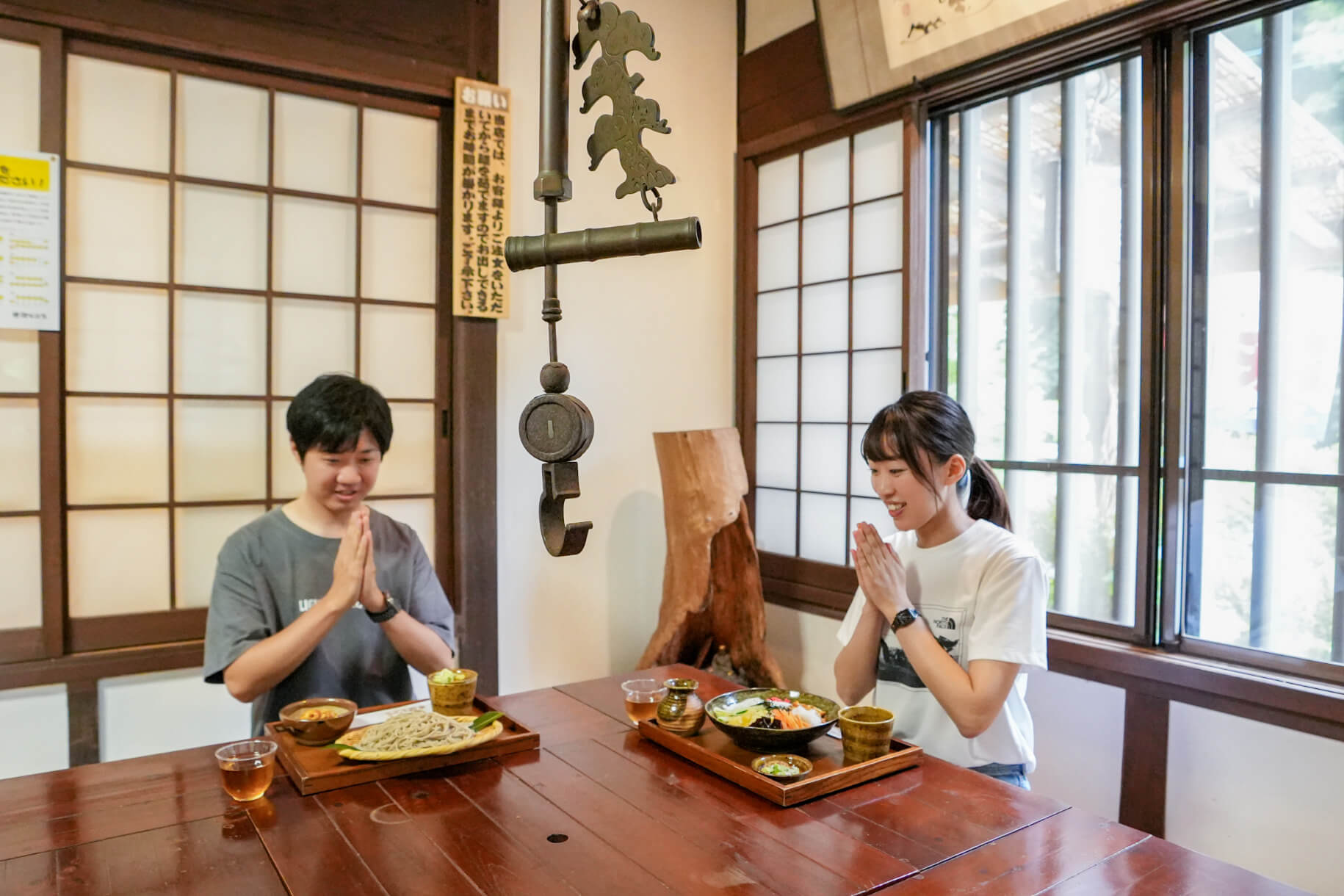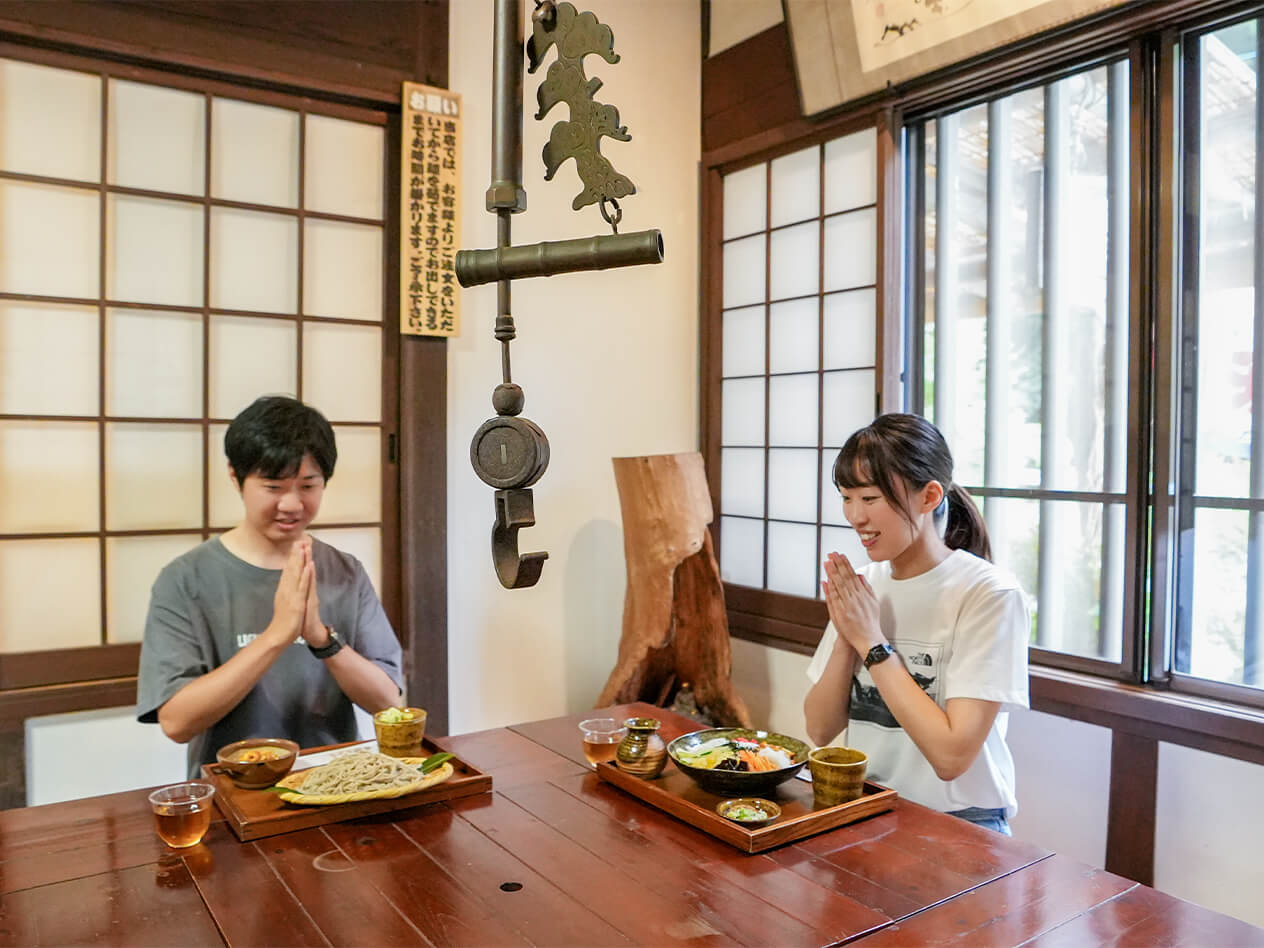 お参りの後は、「観音茶屋」へ。札所巡礼をする方々のお休み処として長く親しまれているこちらは、囲炉裏のあるテーブル席や座敷席があり、ゆったりと過ごせます。多彩なメニューの中から選んだのは、厳選された国産そば粉と秩父産全粒粉を使った手打ちの二八蕎麦。メニューに使われている調味料などをおみやげに買い求めて、おがのまちを後にします。