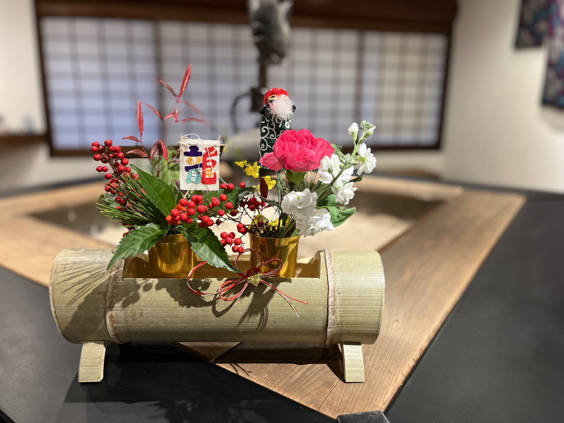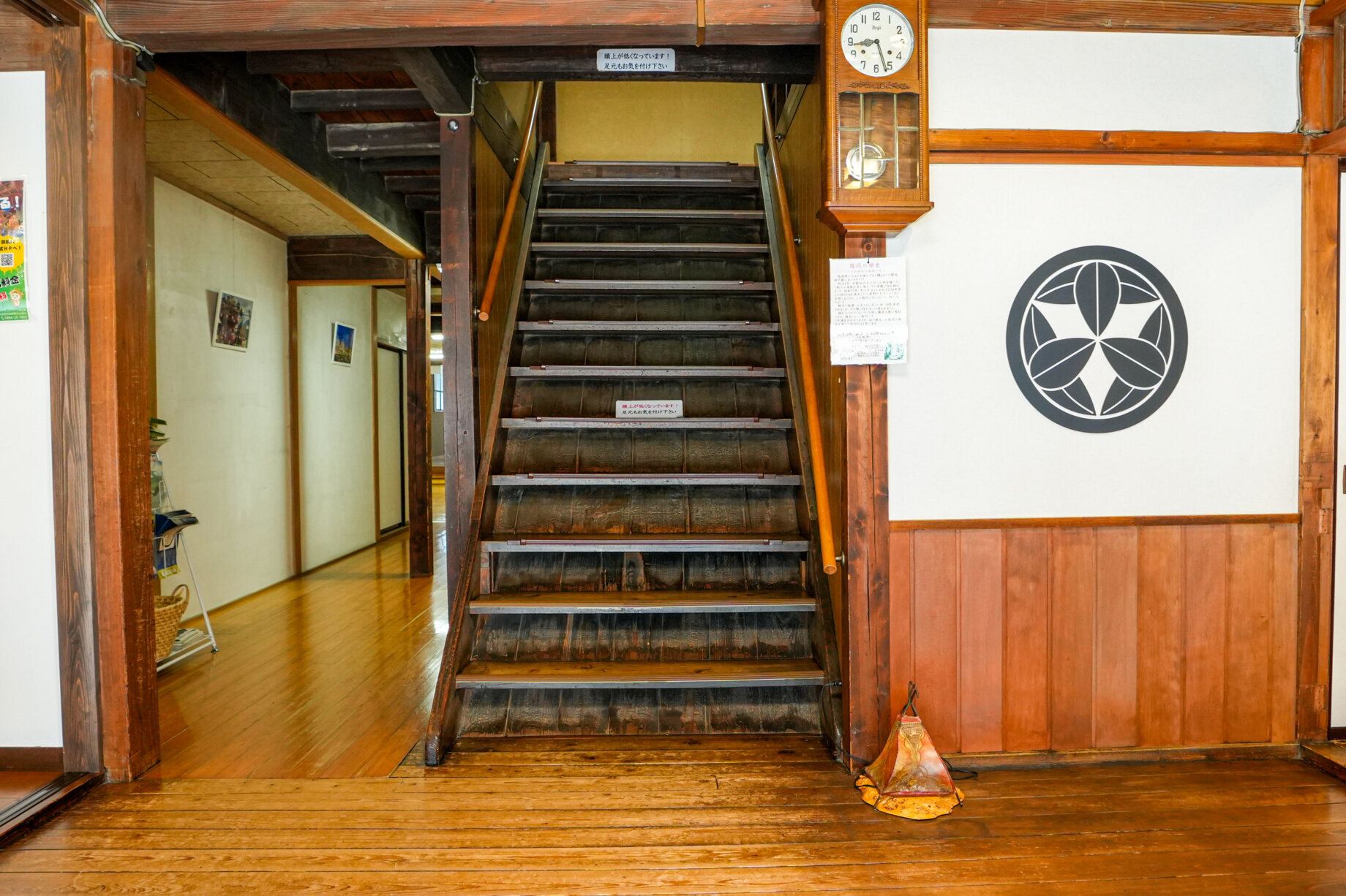 玄関に入ると、時代劇に出てきそうな大きな階段が目の前に飛び込んできます。まだ戦時中だった1944年に町の半分が焼けたと言われる“小鹿野の大火”で当時の建物は全焼しましたが、この立派な階段はその際に持ち出されて、今もここのシンボルのような存在となっています。また、1Fにある囲炉裏テーブルのロビーも印象的。飾り棚のあしらいに季節を感じながら、コーヒーを飲んだり、朝食をいただいたりと、ゆったりとした時間を過ごせます。