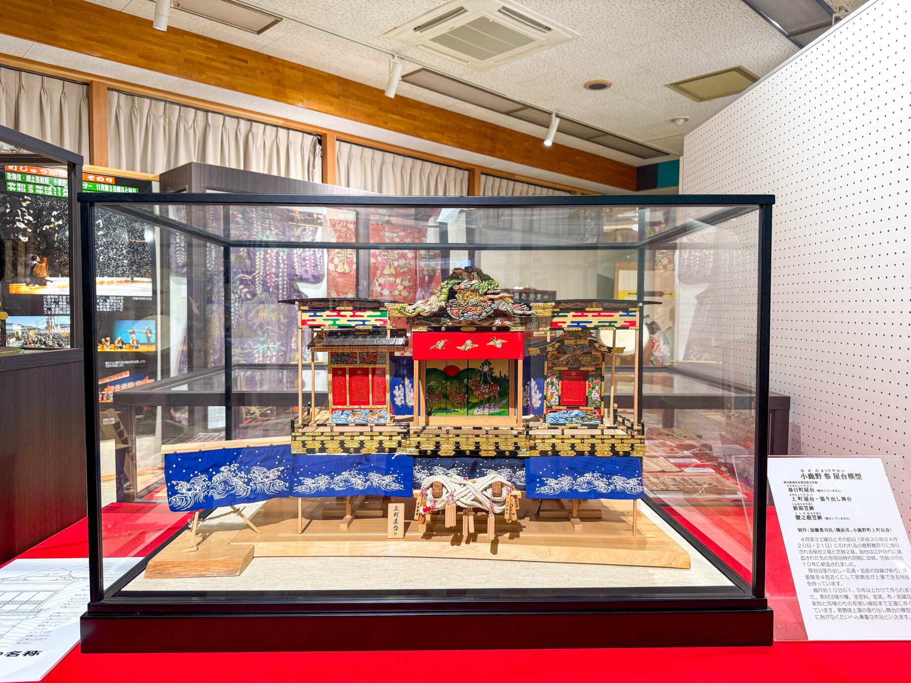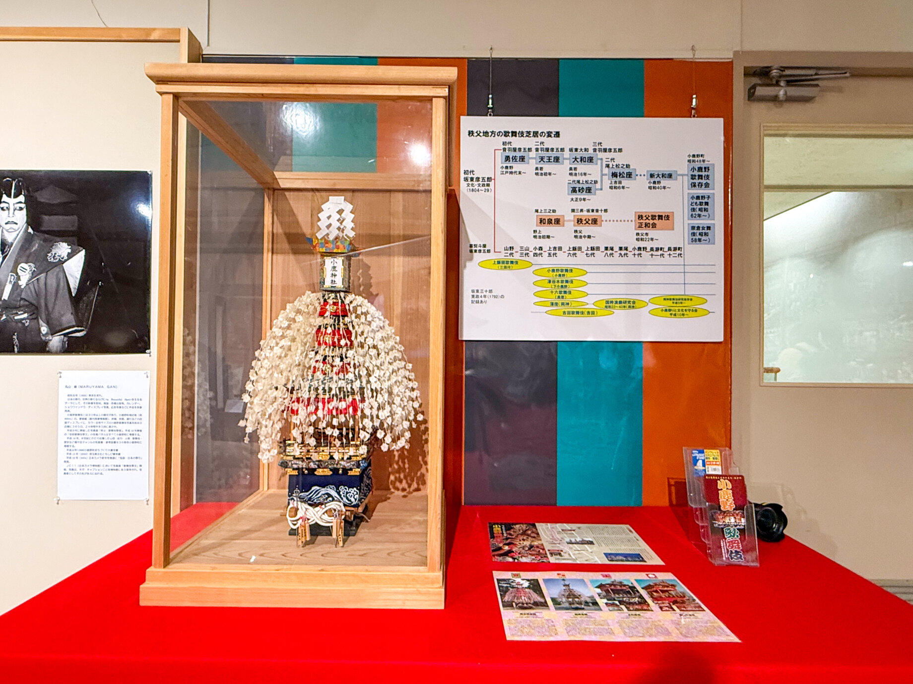 今でもおがのまちでは、町内に6カ所ある歌舞伎の伝承地で年に数回の公演が行われていて、そのさまざまな演目の動画を見られるのも「小鹿野歌舞伎さろん」ならでは。地域によっては祭り屋台(山車)に芸座・花道を張り出す舞台や、麦わらぶきの舞台も現存していたりと、その多様な様子も模型や写真で学べます。さらに下座音楽の楽器に実際に触れることも。お祭りなどで実際に“小鹿野歌舞伎”を経験する前後に、ここで歴史や概要に触れると、より“小鹿野歌舞伎”への興味が深まるかもしれません。