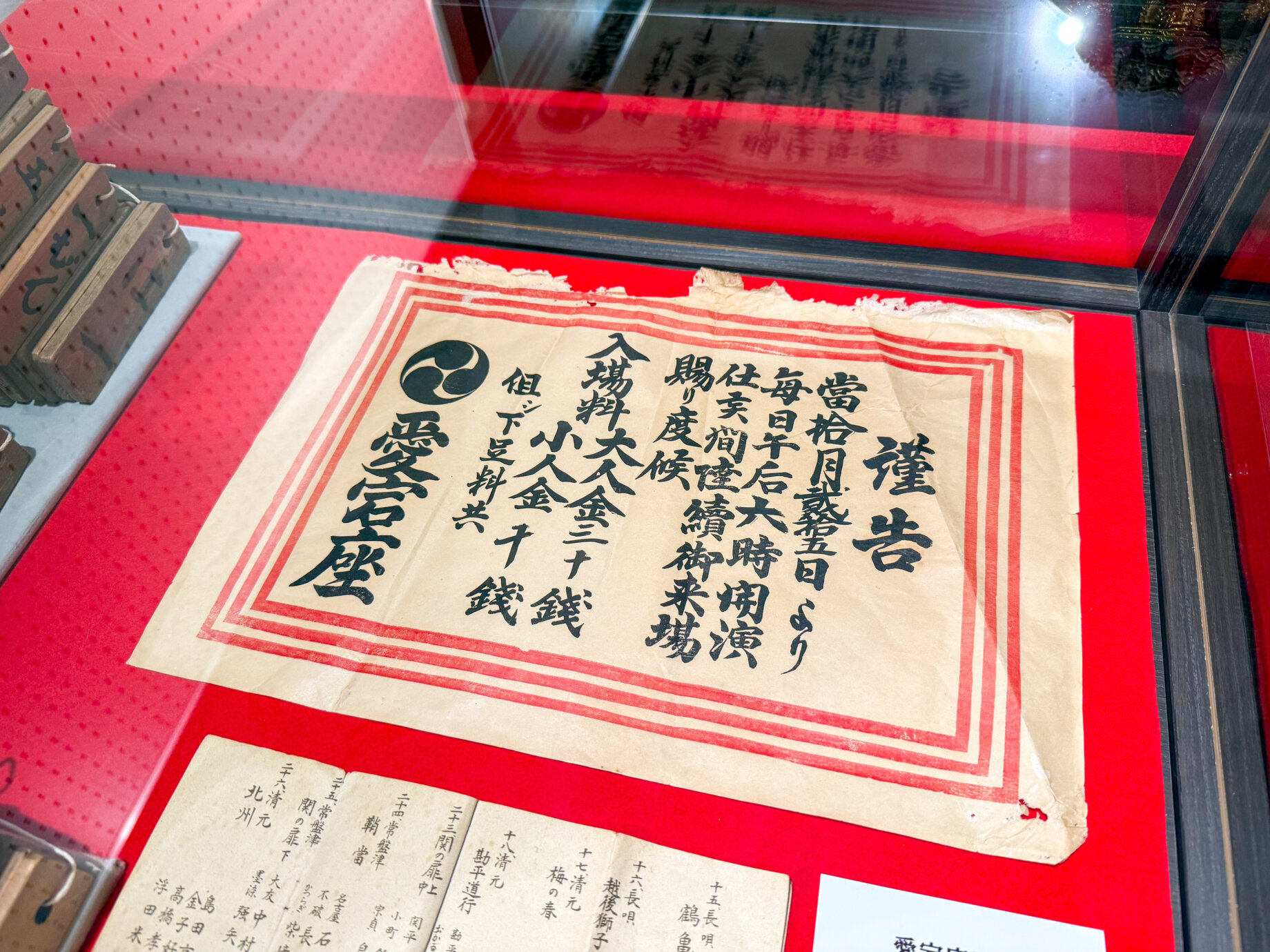 初代・坂東彦五郎が一座芝居組織をし、その後明治・大正期に最盛期を迎えた“小鹿野歌舞伎”。特に1911年から1971年まで中心街の愛宕神社にあった本格的な芝居小屋“愛宕座”での公演は、映画やテレビが普及する前は、この町に住む人の愉しみだったそう。また、子ども達も踊り手として参加するなど、ここはまちの人たちの歌舞伎の発表の場ともなっていたようです。「小鹿野歌舞伎さろん」ではその頃の広告など貴重な資料や、演じている様子の写真なども展示されています。