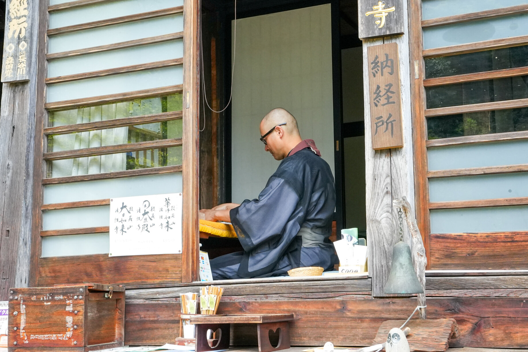 石段を登りきると、山号の“般若山”に由来した般若の面が掲げられている本堂に到着。ここには薬師如来のほか、札所本尊の聖観世音菩薩の前立観音像も祀られています。もちろん御朱印をいただくことも可能で、ご住職が直々に書いてくださいます。さらに、本堂で坐禅を体験することも可能(要予約)。木々が揺れる音、鳥のさえずりが聞こえる中、心を落ち着かせて自分と向き合う時間を持つのは貴重な経験になります。