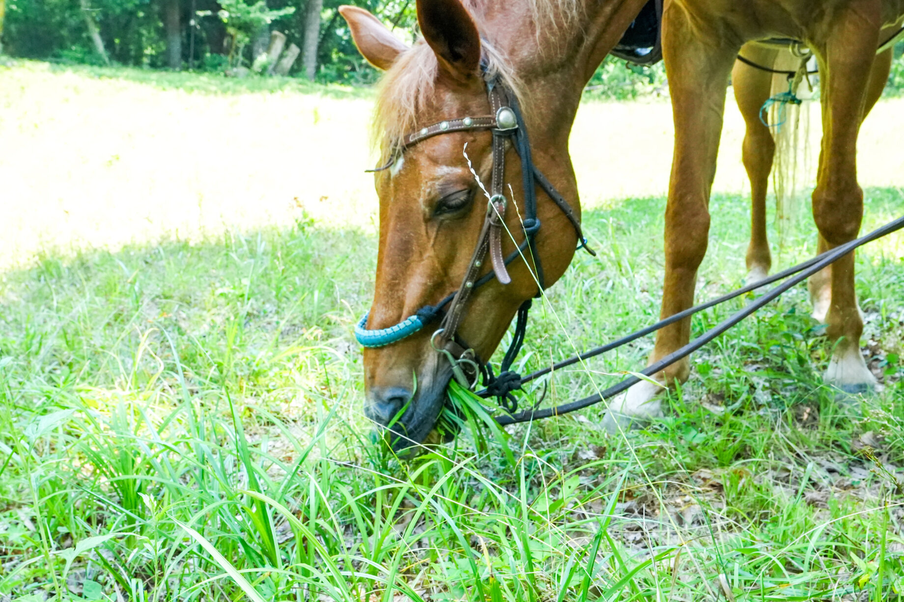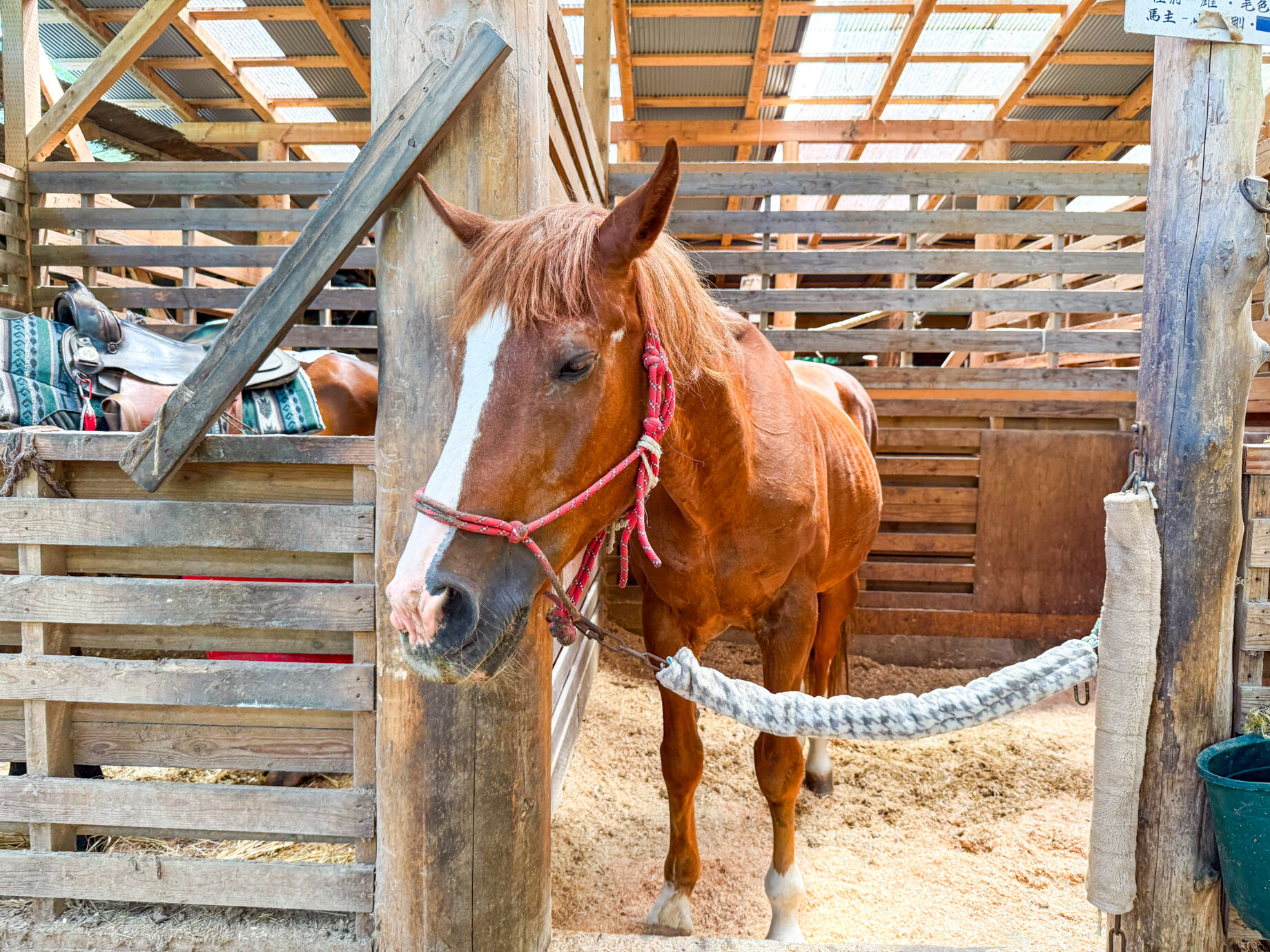 パースチャーでは、オーナーが乗るガイドホースの後につき、スタッフに手綱を引いてもらいながら生い茂る緑の原っぱを散策。馬の体温や呼吸を肌で感じ、一体となって動く喜びを味わえます。高い視点から眺める景色も、乗馬ならではの新鮮な体験です。散策の間には、草場での休憩タイムも。馬が草を食む様子を、馬に乗ったまま観察できるのはここならではの体験で、その生命力をより身近に感じられるひとときです。