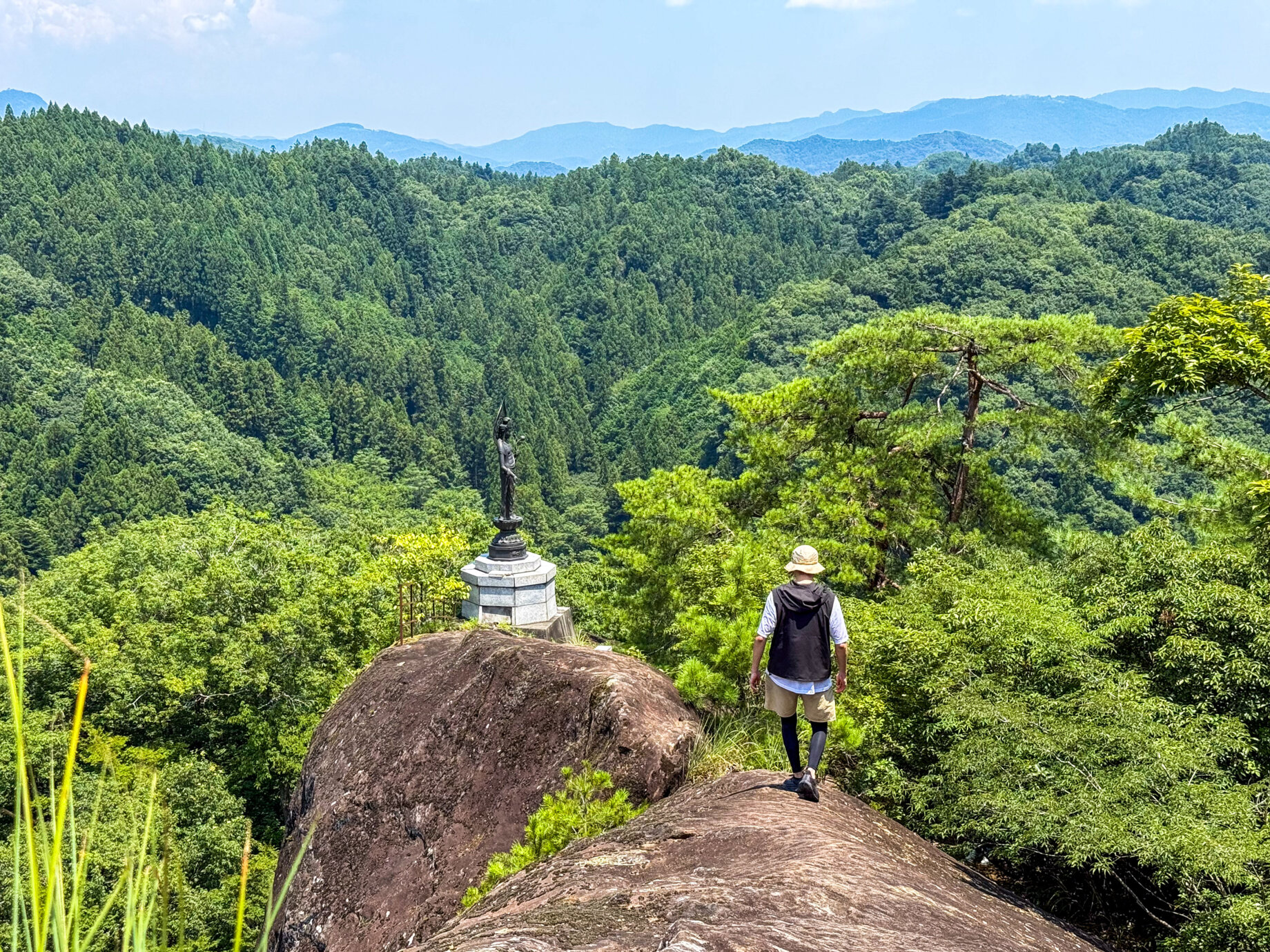 観音堂とタフォニを拝観したら、いよいよ奥の院へ。大きな岩が二つ重なるトンネルを抜け、40分ほど山道を歩くと、“大日如来”と“お船観音”の分岐点に。鎖を頼りに、大きな岩にへばりつくようにしてたどり着くのは、巨大な岩盤の尾根に祀られた“大日如来像”。達成感と合わさってとても神々しく感じられます。一方、「お船岩」と呼ばれる左右絶壁の長い岩の船首にそびえ立つ“お船観音”。足元がすくみながらも先頭まで進むと、そこには凛々しく佇む観音様と、四方の見通しが良いからこそのぞめる空の青さと秩父の山々が。それらが合わさる絶景は一見の価値があります。