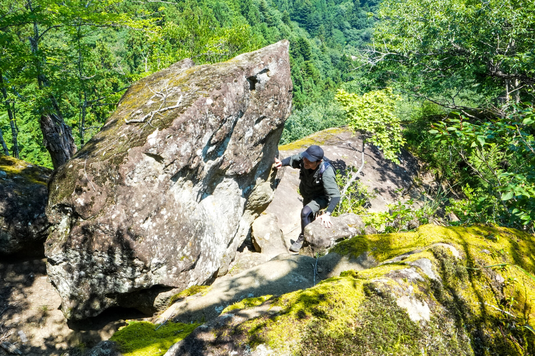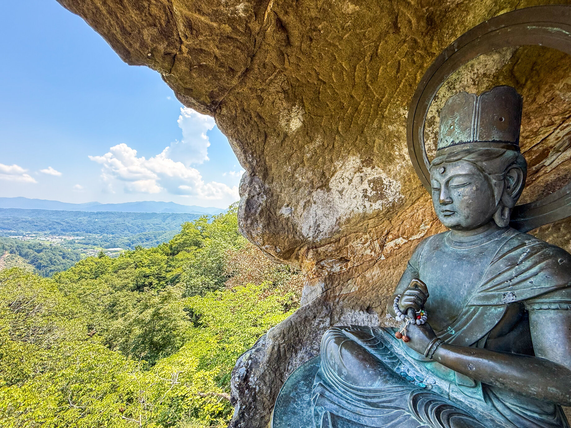 観音堂とタフォニを拝観したら、いよいよ奥の院へ。大きな岩が二つ重なるトンネルを抜け、40分ほど山道を歩くと、“大日如来”と“お船観音”の分岐点に。鎖を頼りに、大きな岩にへばりつくようにしてたどり着くのは、巨大な岩盤の尾根に祀られた“大日如来像”。達成感と合わさってとても神々しく感じられます。一方、「お船岩」と呼ばれる左右絶壁の長い岩の船首にそびえ立つ“お船観音”。足元がすくみながらも先頭まで進むと、そこには凛々しく佇む観音様と、四方の見通しが良いからこそのぞめる空の青さと秩父の山々が。それらが合わさる絶景は一見の価値があります。