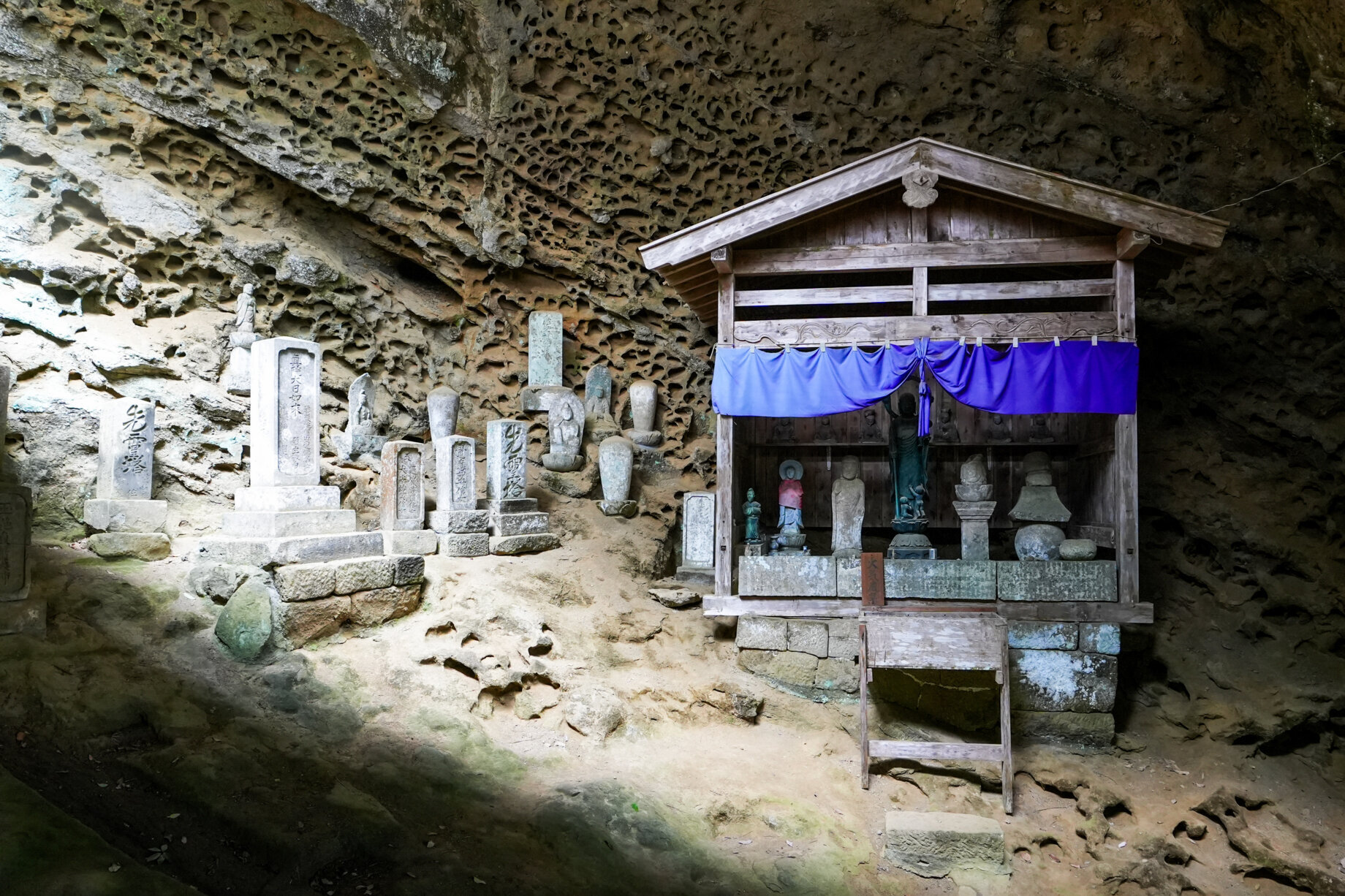 崖の中腹に“懸造り”で建立された観音堂は外からその姿を眺めることはもちろん、“聖観世音菩薩”が安置されている内部にも入ることができます。観音堂の裏には、「タフォニ」と呼ばれる蜂の巣状に穴があいた岩窟が。この穴は、岩石の中の塩類が表面に染み出し、水が蒸発した際に岩石の表面を崩していく風化現象で、まるで自然が生み出したアート。岩窟の中には、子授けのご利益があると言われるお地蔵様も祀られており、自然の力を感じつつ、神聖な空気の流れを感じる場所です。