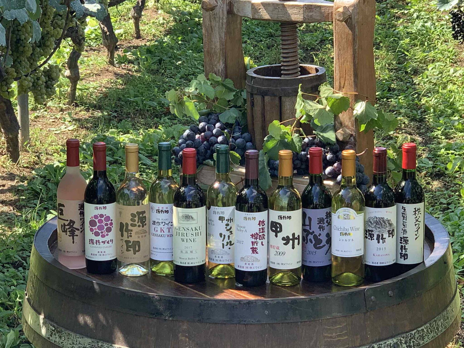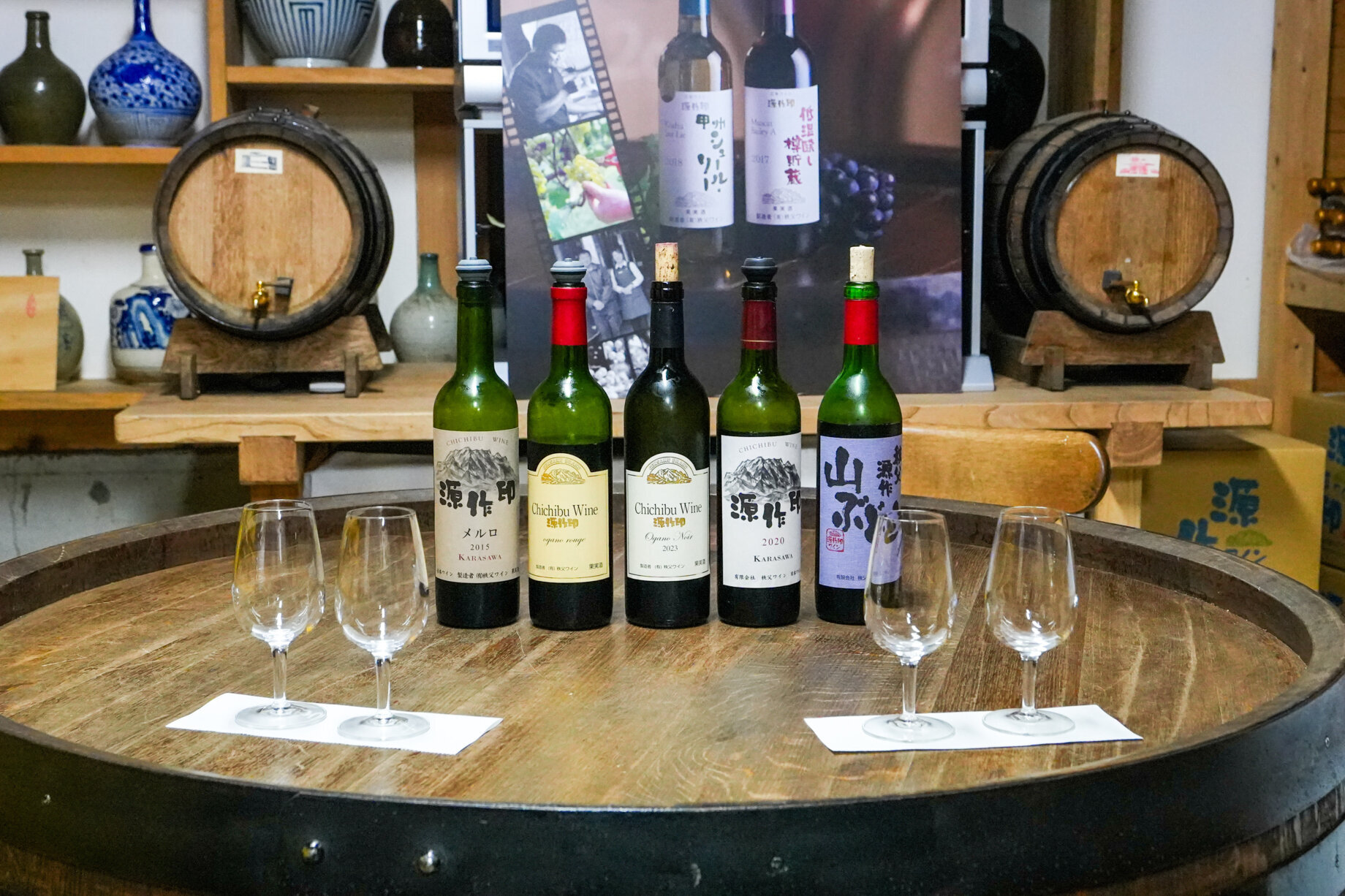 ワインはいずれも“源作印”というブランド名がついています。創業者の浅見源作は”この地にあったブドウの可能性を最大限に引き出すことが奥秩父を潤す”と信じ、”お天道様が実らせたブドウをよく発酵させて、よく寝かせて、健康的なワインをつくる”ため試行錯誤しました。今もこの信念のもと、島田さんと村田さんを中心にブドウの栽培から醸造、販売までを行っているワインは、おがののお土産としても大人気です。道の駅などでも購入はできますが、ヴィンテージや品種によっては、ここでしか買えないものもあるので、造り手を近くに感じ、いろんなお話を聞きながら選んでみてください。