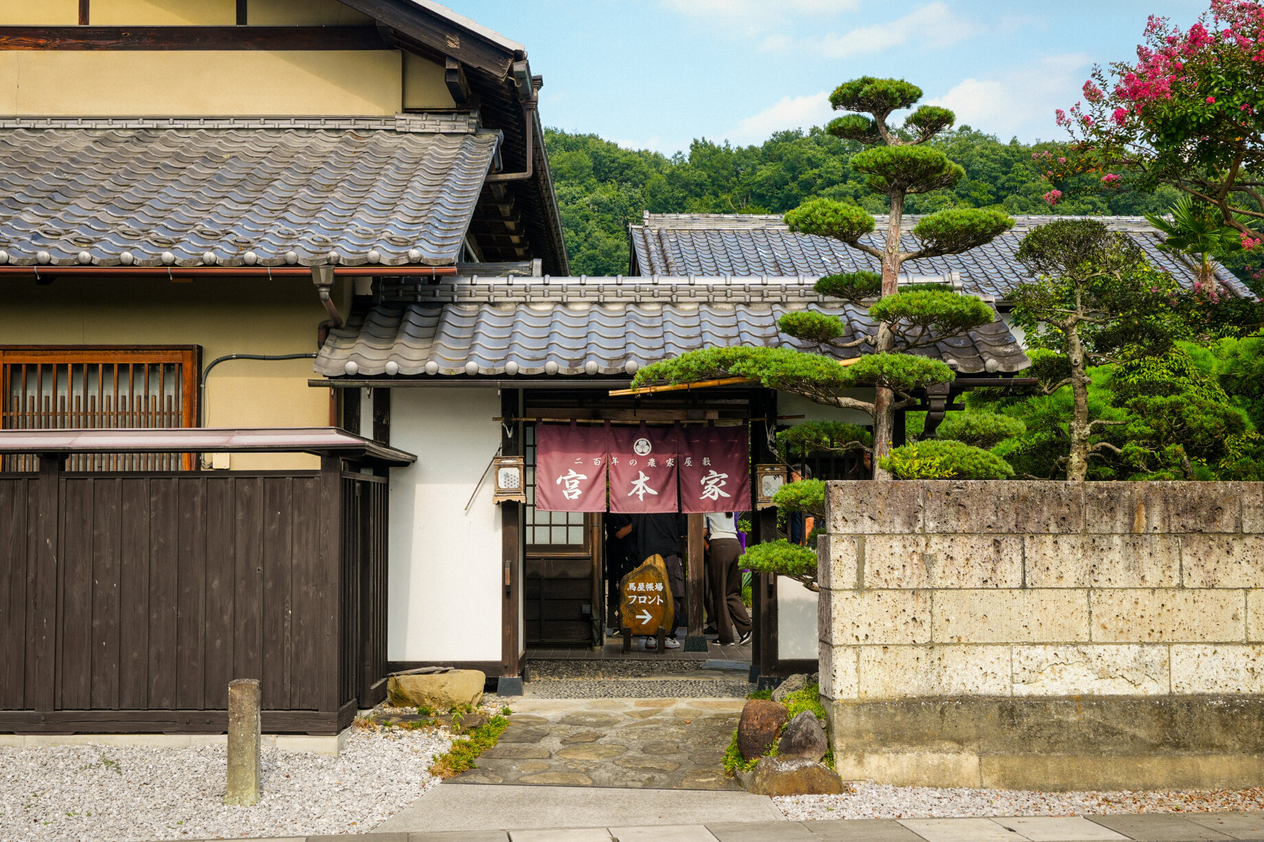 江戸期から続く農家屋敷を宿として受け継いだ「二百年の農家屋敷 宮本家」。お屋敷の歴史を感じられる入り口の暖簾をくぐると、母屋と別邸、蔵がつながる敷地に。太い梁や土壁、囲炉裏を備えた母屋には、二百年の重みと農家の暮らしの息吹が今もなお宿っています。現在の十二代目の当主は、元幕内力士の剣武(宮本一輝さん)。力士として培った感性が随所に生かされ、館内着やしつらえの細部にまで工夫が凝らされています。訪れる人が安らぐ空間を追求しながら、農家屋敷の歴史や日本の相撲文化を大切にし、その魅力を多くの人に伝えている宿です。