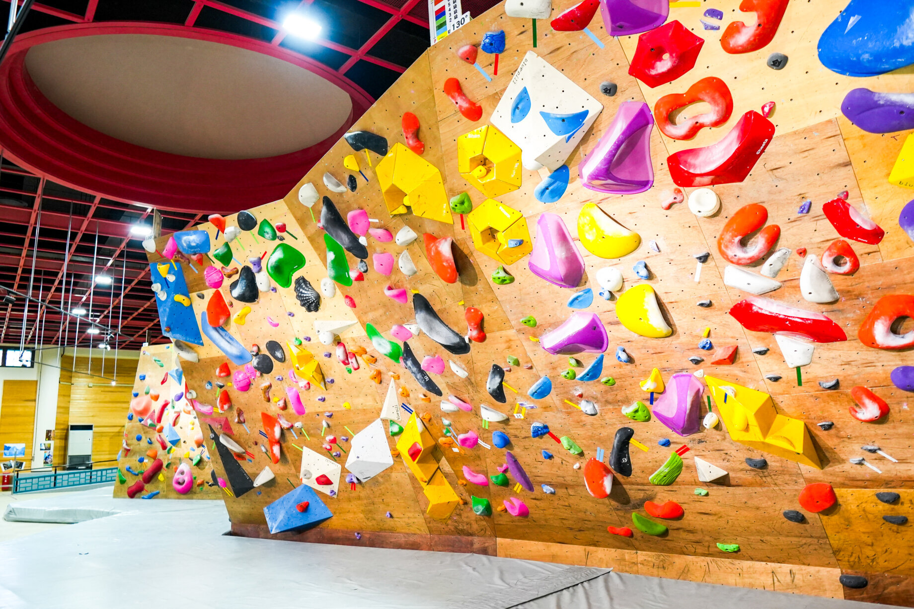 「クライミングパーク神怡舘」の魅力は、秩父地域最大級を誇る本格的なボルダリングウォール。高さ約4.5メートル、横幅35メートルの広々とした空間に斜度80、90、100、110、120、130度の6種類の壁が並び、垂直から強傾斜まで段階的に挑戦できる設計です。初心者にはバランス感覚を試すスラブ(80度あたり)、上級者には体幹力を要するオーバーハング(120度以上)が人気。定期的に課題(クライミングホールドの位置やルート)が更新され、全国中学生ボルダー競技会など全国規模の大会も開催されていることから、プロを目指す選手が腕を磨くクライミングの“登竜門”として全国からも注目を集めています。