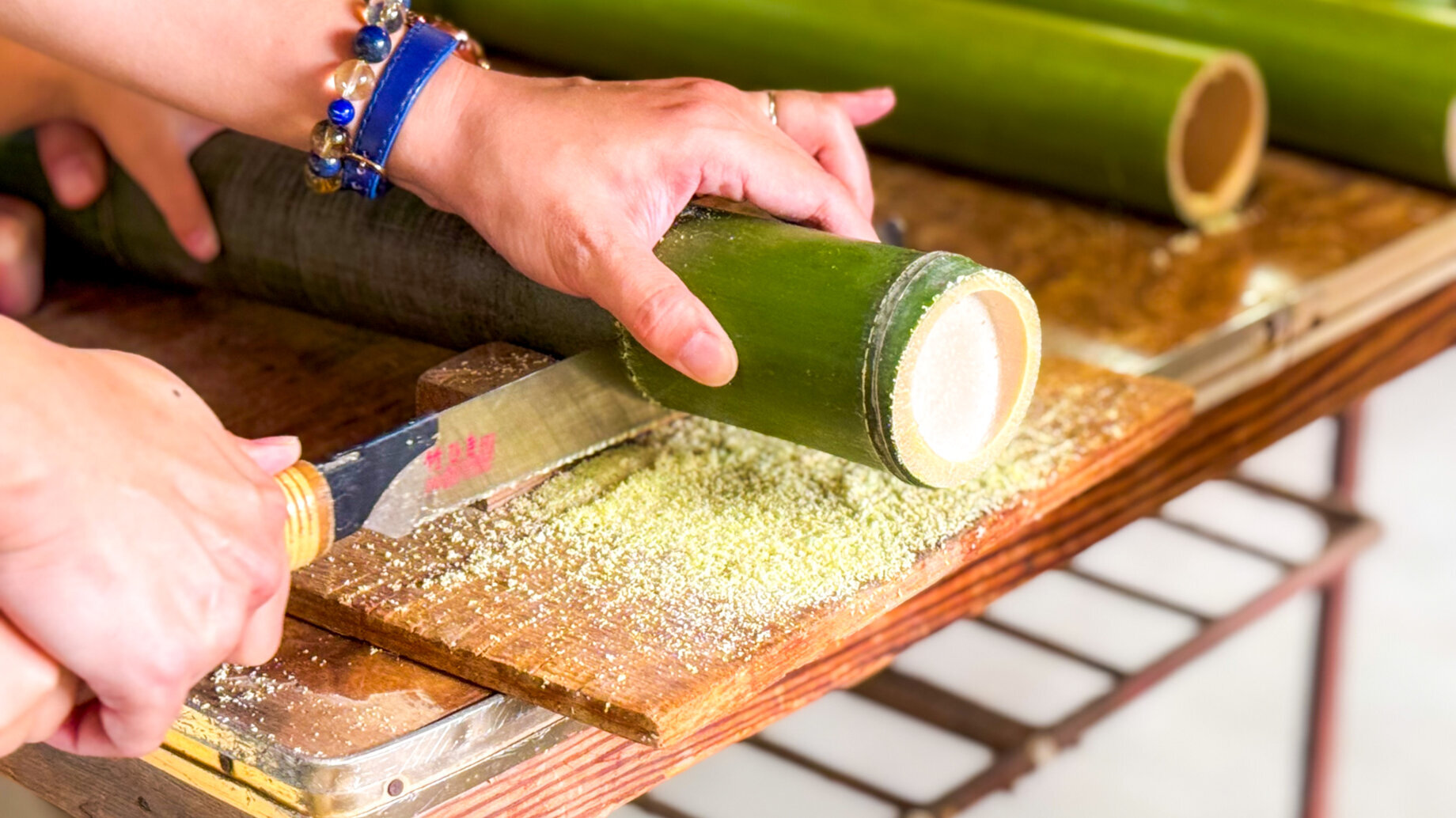 元幕内力士・剣武関(現・二百年の農家屋敷 宮本家 十二代当主)が村長を務める体験型農場「秩父ふるさと村」。年間を通して誰でも楽しめるよう、農場体験、ふるさと体験、自然体験の3つを軸に、2つの体験プランが用意されています。ファミリー層に人気のAプランは、動物とのふれあいや農業体験など自然と親しむ内容。Bプランは大人同士でのんびり過ごしたい人向けに、季節の収穫や果実酒作りなど落ち着いた時間が楽しめます。どちらのプランでも体験できるのが竹細工。コップや皿、箸などを制作でき、旅の思い出を持ち帰ることもできます。
