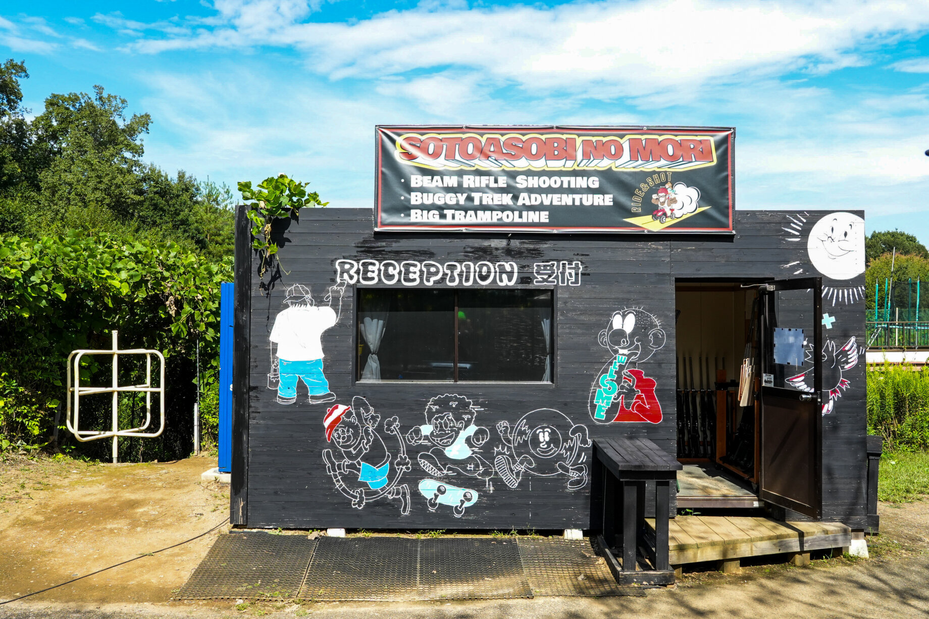 “秩父ミューズパーク”、“スポーツの森”の中にある「ソト遊びの森」。ビッグトランポリン・ビームライフルシューティング・バギートレックアドベンチャーと、3つのアクティビティを楽しむことができる施設です。広大な敷地を使い、子どもから大人までが楽しめる各アクティビティは、設備や乗り物の使い方や、遊び方、安全面の配慮など、ソト遊びの達人でもあるスタッフのレクチャーがあるので、安心して体験できます。
