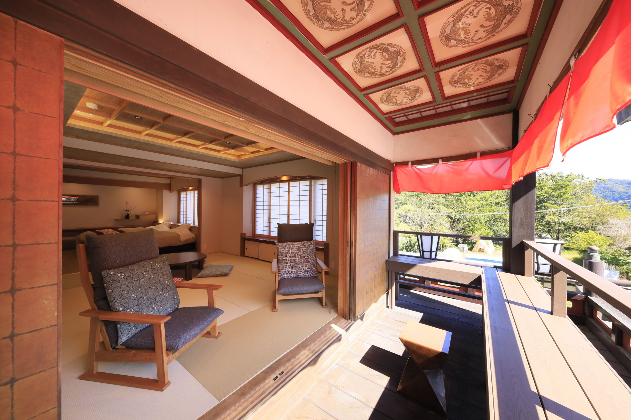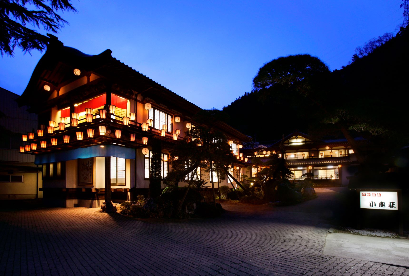 小鹿野温泉郷の一宿として古くより親しまれてきた「小鹿荘(おじかそう)」。国道299号を群馬方面に進んだ山あいに立地します。敷地内にたたずむ“祭り館”は、小鹿神社の春まつりに着想を得てつくられたもの。美しいぼんぼりが灯る姿が印象的で、里山の温かなもてなしとともにお客さまを迎えます。和モダンに改装した「うめ」の部屋は、舞台を模したベランダと客室がひと続きになった造り。周囲の山々を望むビューバス付きで、お湯につかりながら、または部屋でくつろぎながら、大自然や夜空を心ゆくまで楽しめます。
